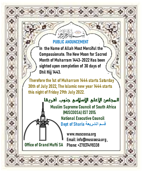 Assalam aleikum Warahmatu-llah, Bismillah Rahman Raheem, Officce of the Grand Mufti of South Africa inform the entire Public and Muslim Community in Particular that the New Islamic Year 1444 Has started This night of friday 2022, Tomorrow Starday 30th 2022 is the first 1st of Muharram 1444. May Allah give us blessings, hapiness, and victory in everything we do in this new year , and protect us from all kinds of evil. Amin.